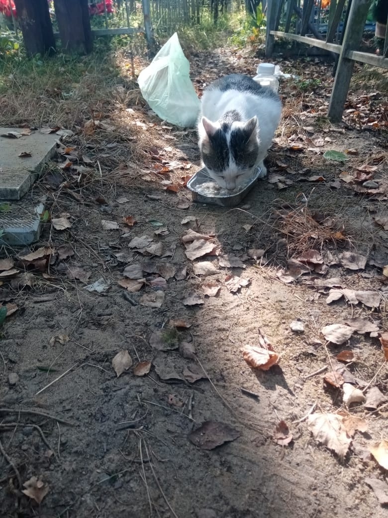 Этого кота обнаружила жительница, которая часто навещает ушедших близких на кладбище. Приехав туда однажды, в начале осени, она увидела, что навстречу ей бежит котик. С собой у нее был незатейливый перекус, который она отдала коту. Кот с аппетитом все съел. Это был совершенно домашний котик-подросток, который понятия не имел, как нужно выживать на улице. С тех пор, дама стала еженедельно приезжать, чтобы покормить питомца. Взять себе она не могла и очень рассчитывала, что кто-то из посетителей его пожалеет и заберет. Но этого не происходило. Приехав однажды, она увидела, что мальчишка роется в помойке, в поисках еды. А какая еда на кладбище?... С жадностью набросился он на принесенную для него еду. А между прочим, это была простая каша, не мясная. Питомец ел и жалобно плакал в процессе. Питаться раз в неделю...долго ли так можно протянуть... Кормилица тоже плакала, стала связываться с местным волонтером, просила пристроить его хотя бы к какому-нибудь подвалу. Все лучше, чем на зимнем к