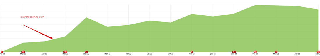 Мы поработали с сайтом в течение марта – после этого предложили клиенту сделать новый сайт сразу под SEO. В апреле собрали сайт с проработанной структурой, внедрили коммерческие факторы, проработали архитектуру URL и оптимизировали сразу все страницы.