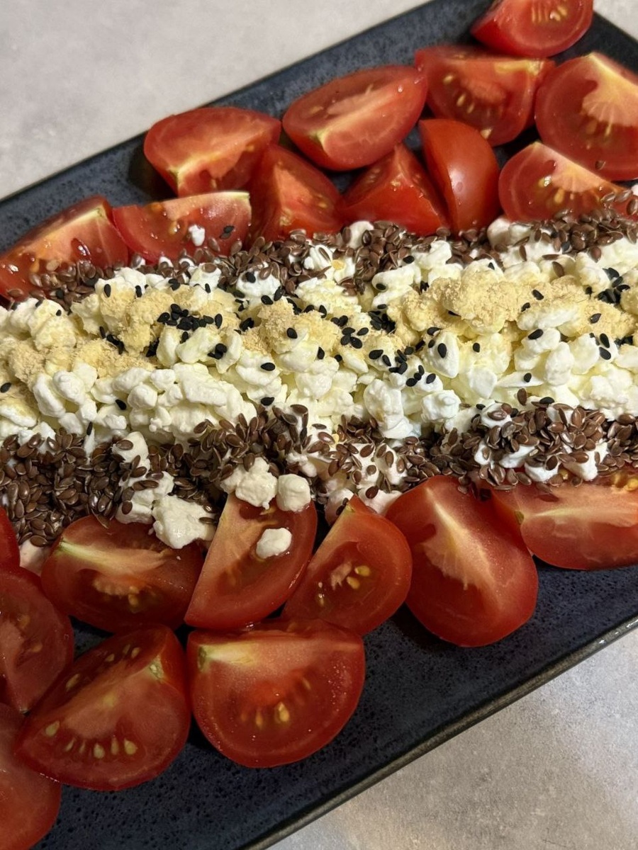 Вновь делимся с вами необыкновенным сочетанием. На этот раз берём зерновой творог. К нему добавляем нарезанные сочные помидоры, добавляют необходимой свежести в это блюдо.