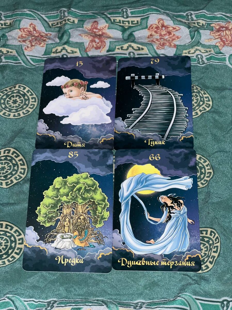 1: ДИТЯ Доверие, верность ,духовный ученик карта благоприятная означает богатый выбор возможности начало пути. 2: ТУПИК Отмена действий, передышка вам нужно остановиться и подумать что вы оставляете в прошлом и что берёте с собой в новое будущее. 3: ПРЕДКИ Родовое дерево ,почитание предков , память, защита ,если у вас нету места силы его нужно создать. 4: ДУШЕВНЫЕ ТЕРЗАНИЯ Нестабильная психика, очень шаткое эмоциональное состояние нужно побыть с собой на единение , не вступать в конфликт .