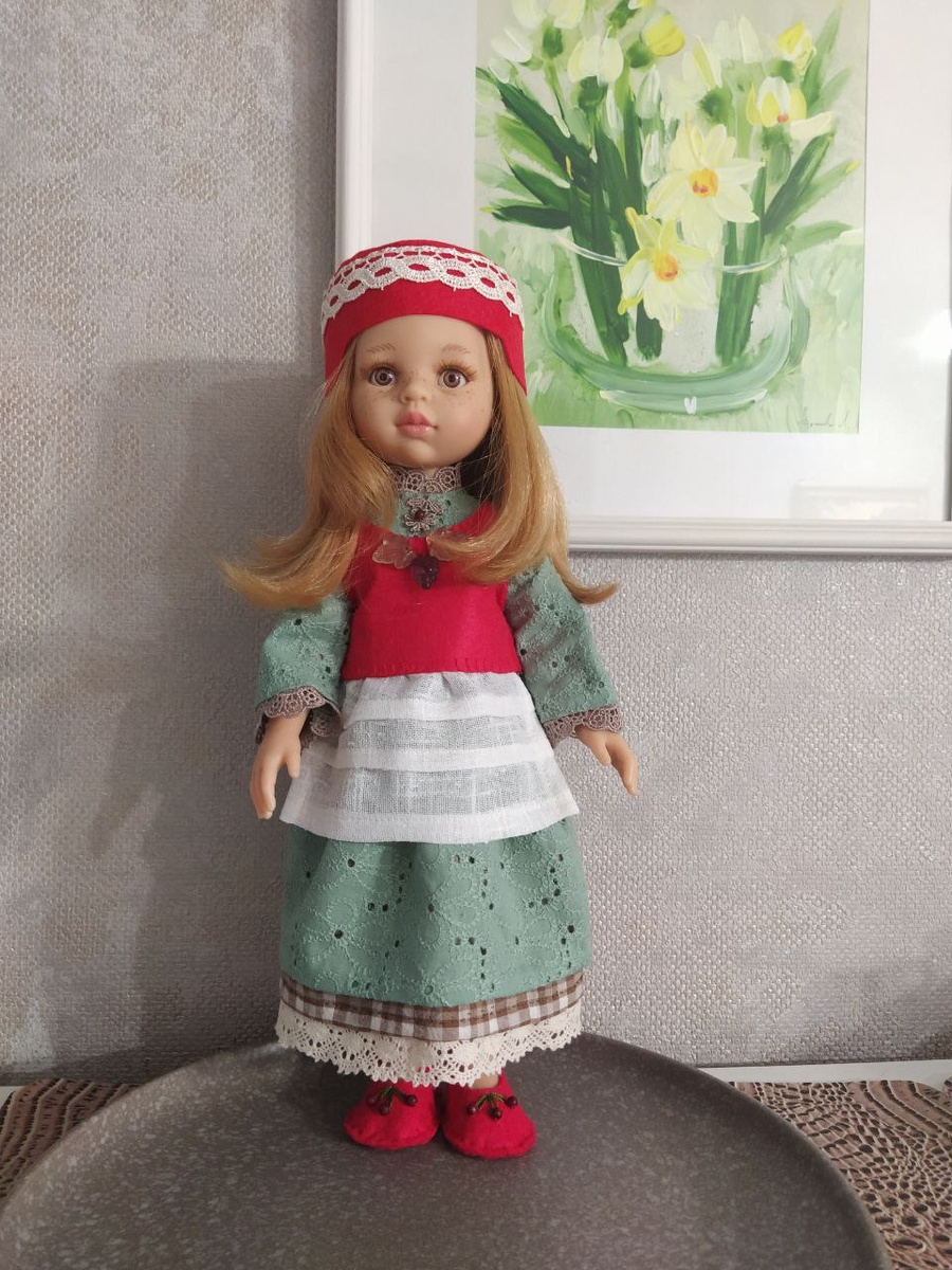 Дошила я костюм Красной шапки. Не торопилась, как и обещала. Куклы у меня исключительно интерьерные, а значит, их надо рассматривать, любоваться деталями. Деталей всяких лучше побольше… Не знаю почему, но мне гвоздем в голову засел этот самый костюм. Я сказку Красная шапочка в детстве не особо любила, меня удивляла мама, которая посылает ребенка через лес, да еще с наказом – с Волком не разговаривать. А с кем там в лесу общаться- с пьяницами (зачеркнуто) дровосеками или с бездельником охотником? Сама бы сходила, больше могла бы старушке еды принести. Шучу… А потом до меня дошло, Красная шапочка это про нас сказка, про советских детей, которым сейчас в районе 60. Мы быстро становились самостоятельными, родители не стеснялись навешивать на нас обязанности по дому, они ведь работали аж 8 часов в день, целых пять дней в неделю. Мы учились, ходили в кружки, все это самостоятельно. Репетитор – это был странный зверь либо для совсем уж отставшего ребенка, реже для поступления в какой-нибудь с
