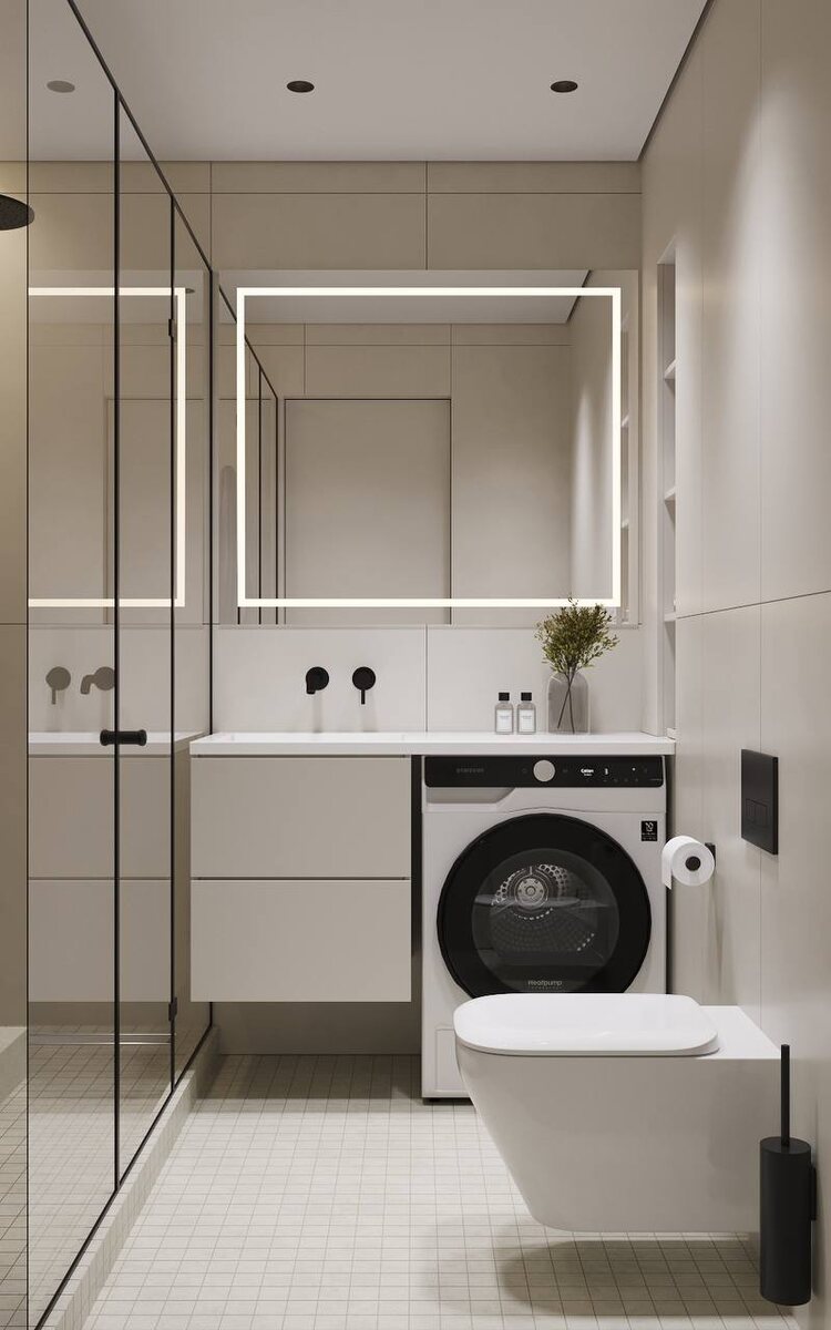 ВИЗУАЛИЗАЦИИ. Часть 2. Квартира холостяка в Царицыно 42м2. Продолжение проекта выше, санузел и гардеробная. 🔹В санузел поместили стирально-сушильную машину, много хранения, скамейку в душевой и теплые стены в качестве полотенцесушителя, большое зеркало с подсветкой; 🔹Гардеробная - основной запрос заказчика, тоже получилась функциональной, тех-шкаф у входа, хранение большого количества обуви, одежды и всех остальных вещей. Основные запросы заказчика учли, будут небольшие корректировки по цветам и текстурам.