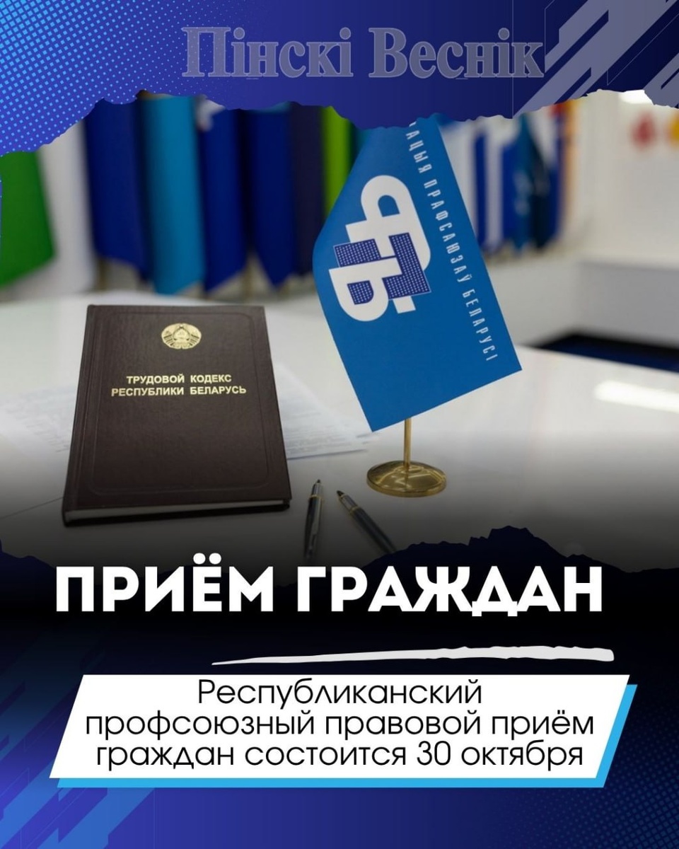1️⃣1️⃣1️⃣2️⃣1️⃣1️⃣3️⃣9️⃣2️⃣ ✏️Правовые инспекторы труда профсоюзов окажут бесплатную юридическую помощь гражданам по вопросам, связанным с защитой трудовых прав и социально-экономических интересов. 👆ПЛАН-ГРАФИК профсоюзного приема в Пинске на 30 октября 2025 г. 📎Государственное лесохозяйственное учреждение «Пинский лесхоз», г. Пинск, ул. Шубитидзе, д. 28. Время приема: 10.00-12.00 ✨Пинская районная профсоюзная организация Белорусского профсоюза работников агропромышленного комплекса, г. Пинск, ул. К. Маркса, 28. Время приема: 12.15-14.15 🔔Тел. для предварительной записи 8(0162) 21 87 90