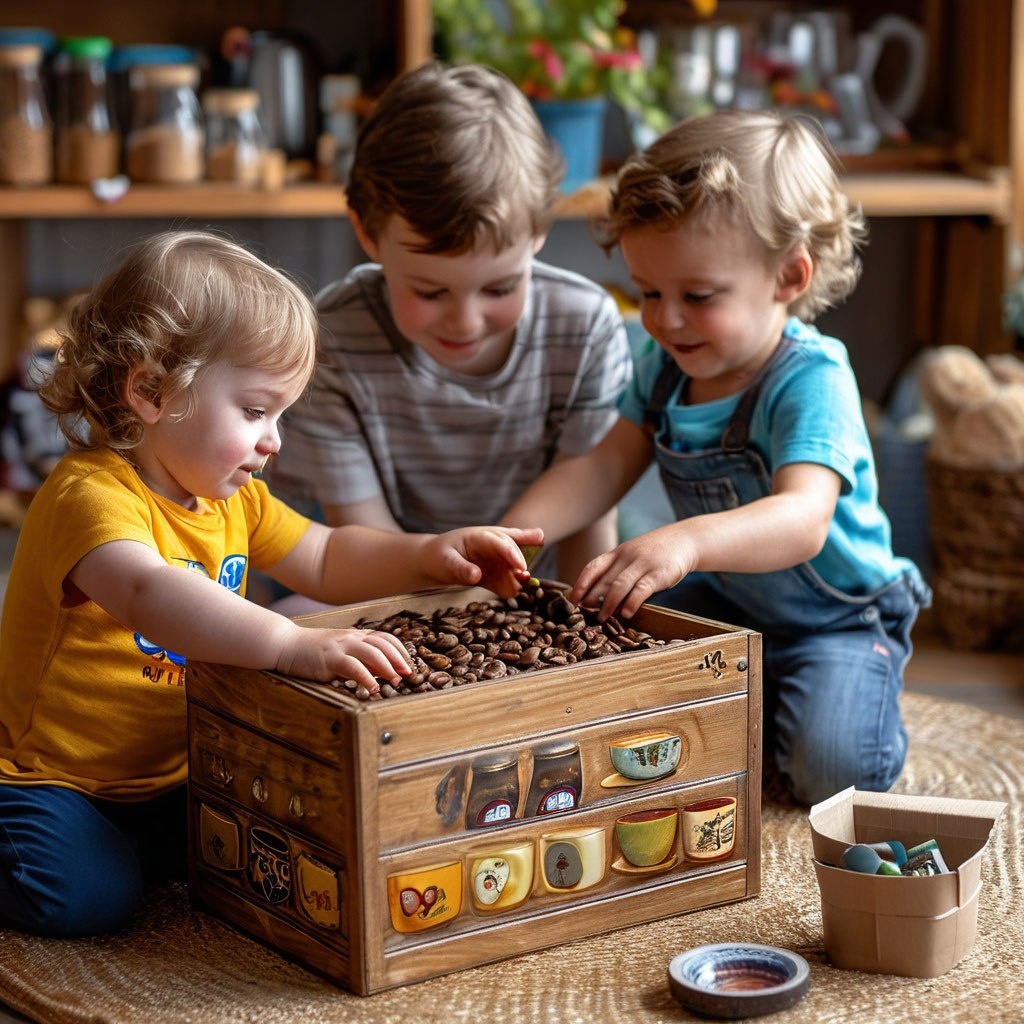 Ребёнок погружает руки в коробку, наполненную фасолью, крупой, песком или кинетическим песком, и выполняет в ней игровые задания. Это естественный способ развивать сенсорное восприятие, внимание и мелкую моторику.