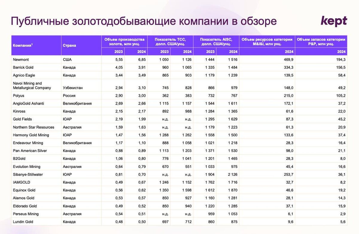 Нашли неплохой документ про золото от kept, делимся с вами основными тезисами. В выборке Kept суммарное производство в 2024 году — 44 005 тыс. унций. Средневзвешенный уровень совокупных денежных расходов (TCC) по выборке — $994/унц., средний AISC — $1 388/унц.. Это фон, на котором надо смотреть на компании и регионы. У кого самая маленькая себестоимость? По итогам 2024 года лидер по минимальным затратам — российская группа Полюс: TCC — $383/унц., AISC — $767/унц. при производстве ~3 002 тыс. унций. Это существенное преимущество по себестоимости против глобальных г игантов. Глобальная картина затрат — TCC по крупнейшим мировым игрокам: Newmont — $1 126/унц., Barrick — $1 065/унц. — AISC по крупным игрокам: Newmont — $1 516/унц., Barrick — $1 484/унц. Региональные тренды — Северная Америка: производство топ-компаний 12 442 тыс. унц.; AISC вырос — до $1 490/унц. (рост 4.5% у выборки). Рост затрат объясняют CAPEX на поддержание, сервисы подрядчиков и падение реализации на отдельных