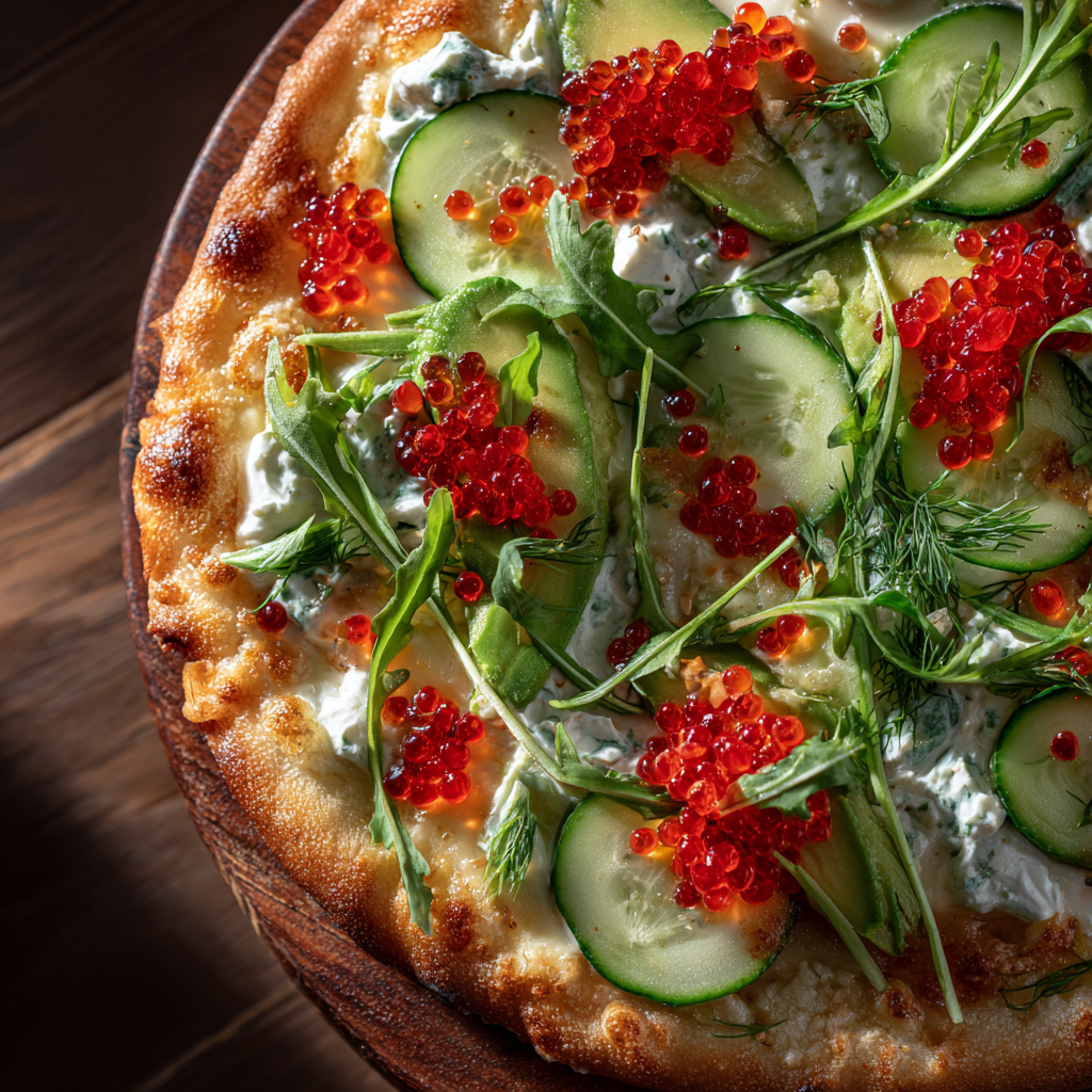 Тонкая хрустящая корочка, сливочная страчателла, свежий авокадо, хрустящий огурец и королевская красная икра сверху. Каждый кусочек — маленький праздник, каждый вкус — роскошь. Ингредиенты (на пиццу ~25 см): Тесто: * 150 г пшеничной муки * 90 мл тёплой воды * 3 г сухих дрожжей (~½ ч.л.) * ½ ч.л. соли * 1 ч.л. оливкового масла Начинка: * 80 г страчателлы или сливочного сыра * 40 г красной икры * ½ авокадо, тонкими слайсами * ½ свежего огурца, тонкими слайсами * Пучок рукколы * 1 ч.л. оливкового масла * ½ ч.л. лимонного сока * Свежемолотый чёрный перец по вкусу Как приготовить Тесто: Растворите дрожжи в тёплой воде, дайте постоять 2–3 минуты. Добавьте муку, соль и масло, замесите мягкое эластичное тесто. Накройте полотенцем и оставьте на 30–40 минут, чтобы увеличилось вдвое. Основа: Разогрейте духовку до 220°C. Раскатайте тесто на круг ~25 см, переложите на противень с пергаментом. Слегка смажьте оливковым маслом.. Выпекайте 6–8 минут до золотистой хрустящей корочки. Сборка: Дайте пицце