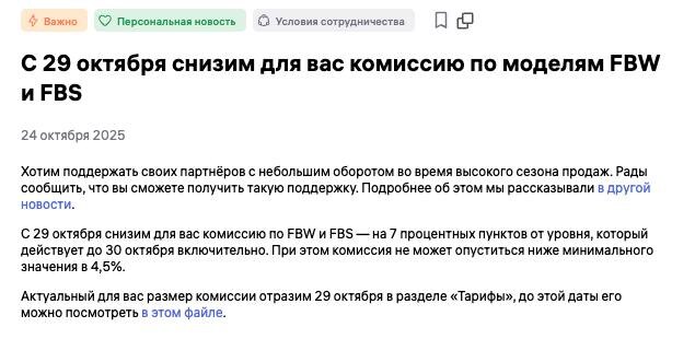 «С 29 октября снизим для вас комиссию по моделям FBW и FBS на 7 п.п.»
