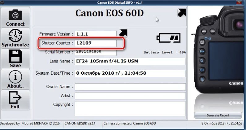 • Программа покажет счётчик срабатываний затвора (Shutter Counter)