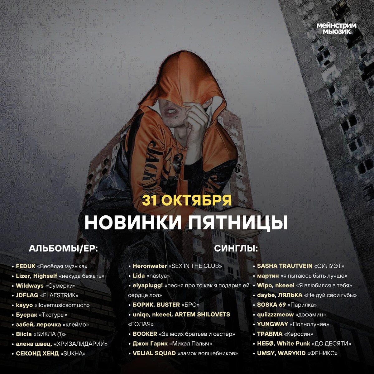 🗓 НОВИНКИ ПЯТНИЦЫ — 31 ОКТЯБРЯ Альбомы/EP: • FEDUK «Весёлая музыка» • Lizer, Highself «некуда бежать» • Wildways «Сумерки» • JDFLAG «FLAГSTRИК» • kayyo «ilovemusicsomuch» • Буерак «Ткстуры» • забей, лерочка «клеймо» • Biicla «БИКЛА (1)» • SYNZ «СВЯЗАНЫ» • алена швец. «ХРИЗАЛИДАРИЙ» • СЕКОНД ХЕНД «SUKHA» • Slatt Savage «Слайм Пэйн» • Экси «MENTAL GAMES» • ISAEVA «Грани» • SKB «ДИЛЕММА» • H8.HOOD «WIP» • ahhnahh «nahhoween» • HighSwag «X220AM» Синглы: • Heronwater «SEX IN THE CLUB» • Lida «nastya» • elyaplugg! «песня про то как я подарил ей сердце лол» • БОРИК, BUSTER «БРО» • ЛСП «Терминатор» • uniqe, nkeeei, ARTEM SHILOVETS «ГОЛАЯ» • BOOKER «За моих братьев и сестёр» • Джон Гарик «Михал Палыч» • VELIAL SQUAD «замок волшебников» • SASHA TRAUTVEIN «СИЛУЭТ» • Thomas Mraz, Baby19! «Фотки» • мартин «я пытаюсь быть лучше» • Wipo, nkeeei «Я влюбился в тебя» • LILDRUGHILL «a letter to myself» • daybe, ЛЯЛЬКА «Не дуй свои губы» • SOSKA 69 «Парилка» • Рыночные отношения, Слава КПСС «Untitled