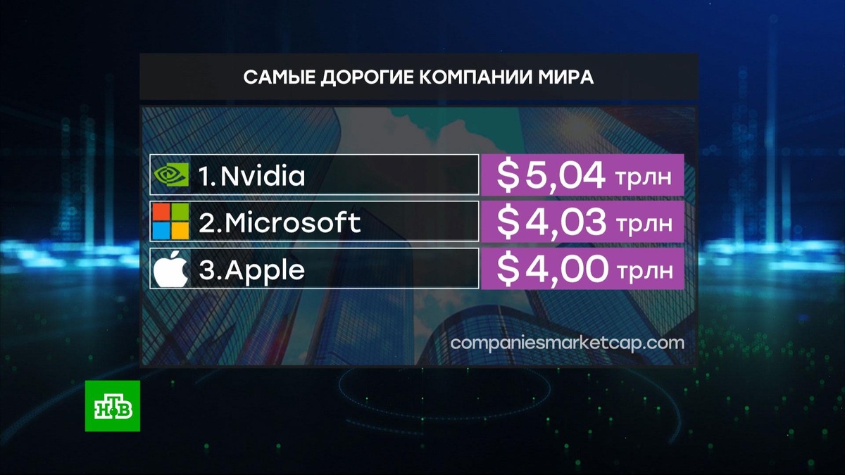 [ Смотреть видео на сайте НТВ ] Капитализация разработчика графических процессоров Nvidia превысила $5 триллионов, она стала первой в истории компанией, которой удалось преодолеть этот барьер. В среду цена акций Nvidia выросла более чем на 4%. Ранее, в начале июля, Nvidia стала первой компанией с капитализацией выше $4 трлн. Еще десять лет назад стоимость компании составляла $10 млрд. За последнее десятилетие акции выросли более чем на 44 000%, опередив биржевые индексы Nasdaq (рост на 420%) и S&P 500 (263%). Инвестиции в размере $1000 в Nvidia, когда акции достигли минимума в $0,47 в феврале 2015 года, сейчас стоили бы $441 000. Nvidia опережает Microsoft ($4 трлн) и Apple ($4 трлн), а также родительскую компанию Google Alphabet ($3,2 трлн), Amazon ($2,4 трлн) и Meta ($1,8 трлн.) (Meta запрещена в России как экстремистская). Рекордные показатели были достигнуты благодаря растущему спросу на аппаратное и программное обеспечение для искусственного интеллекта. Среди крупнейших клиентов N