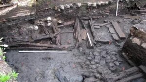 «После полутора метров современного техногенного слоя мы вышли на каменную мостовую XVIII века, сразу под которой — картина одного дня. В 1710 году Петр со второго раза берет Выборг. Переправляет мортирные батареи на Смоляной мыс и начинает двухдневную бомбардировку города в июне 1710 года. И вот Каменный дом. Дом богатого горожанина. Рядом с ним участок, на участке деревянное строение, в котором находился загон для коз, потому что жители занимались пряжей. А во второй половине — производственная история: стоял ткацкий станок. А дальше прилетает мортирная бомба. К тому времени на участке почти три метра культурного слоя. Ядро падает, пробивает культурный слой. Один из осколков ядра, видимо, летит в это деревянное строение, разбивает деревянную дверь с металлическими петлями. И вот с утра после бомбардировки жители дома выходят на улицу, видят картину этого разорения и начинают как-то прибираться. Берут эту деревянную разбитую дверь, снимают со здания и ею закрывают дырку, куда упало ядро. И то, что это 1710 год, начало XVIII века, мы видим по археологическому материалу. И вот картина одного дня, когда закончилось шведское время, наступило русское», — отмечает Александр Смирнов.
