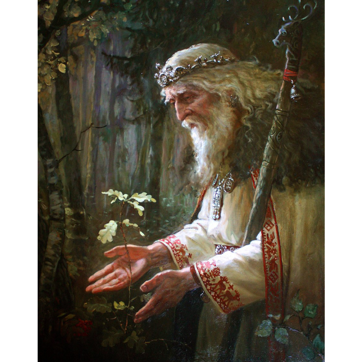 «Как твое имя, Хранитель места заповедного?» - спросил я. Зашумела дубрава вокруг… Белые искорки-цветы, казалось, одновременно взмыли в воздух… Из травы под ногами, из листвы в небесах, из жужжания насекомых вокруг и из цветочного хоровода соткался образ высокого статного старца, чьи-снежно белые волосы сияли в свете проникшего на поляну луча солнца. «Я – Святибор. Хранитель и покровитель всего растущего на земле, и всего живого, что связно с растущим на земле – от мельчайшей букашки до насекомого и червяка. От травинки и былинки до могучих мачтовых сосен в лесах и борах – все это моя забота».