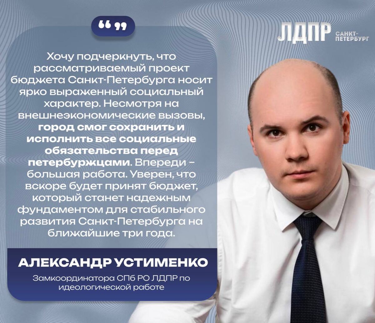 ЛДПР поддержала проект бюджета Санкт-Петербурга на 2026–2028 годы Фракция ЛДПР участвовала в обсуждении бюджета с участием Губернатора Александра Беглова. Документ сочетает социальную направленность со стратегическим видением развития города. Приоритеты - поддержка петербуржцев, развитие инфраструктуры и выполнение задач, поставленных Президентом РФ. В 2026 году доходы города составят 1,454 трлн рублей, расходы - 1,642 трлн рублей. Среднегодовой прирост доходов прогнозируется на уровне 7%. ЛДПР поддержала принятие бюджета в первом чтении. От фракции был задан вопрос о развитии дворовых спортивных инициатив и вовлечении людей серебряного возраста в занятия физкультурой. Губернатор и Вице-губернатор Наталья Чечина подтвердили, что необходимые средства в бюджете предусмотрены. Александр Устименко, заместитель координатора по идеологической работе: «Проект бюджета Санкт-Петербурга носит ярко выраженный социальный характер. Несмотря на внешнеэкономические вызовы, город сохраняет все соци