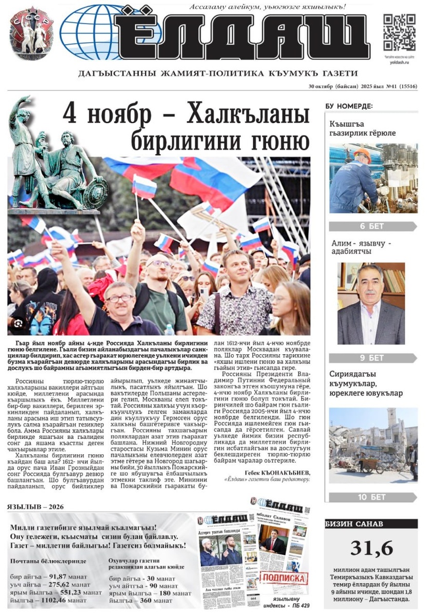 Вышел новый номер республиканской газеты «Ёлдаш» №41 от 30 октября 2025 года.