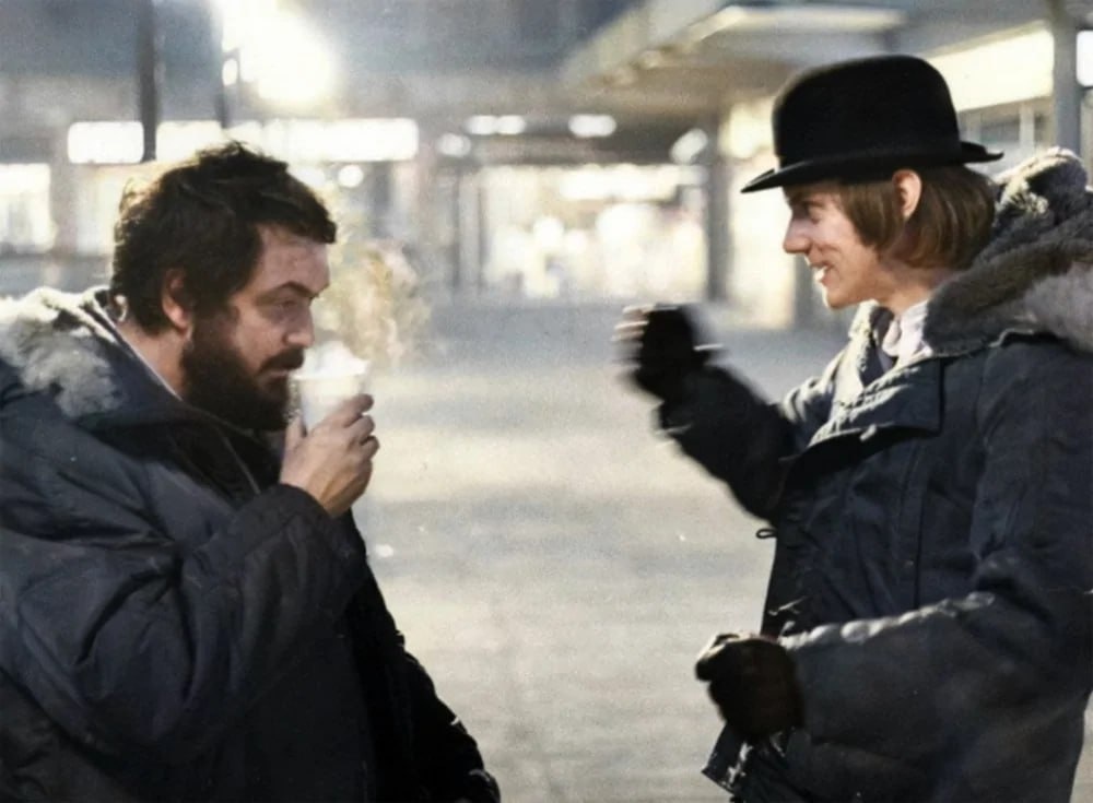 Легендарный режиссёр Стэнли Кубрик и актёр Малкольм Макдауэлл, воплотивший на экране Элексира, запечатлены в рабочей обстановке на площадке культового фильма «Заводной апельсин» в 1971 году.