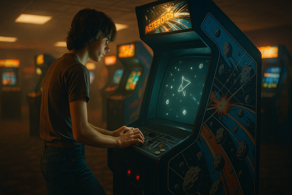 Потому что это «чистая механика» и бесконечная петля сложности, язык нескольких десятилетий игр. Аркада Atari вышла в ноябре 1979-го, мгновенно стала хитом, а к 1980-му стояла почти в каждом приличном зале. Она была проста снаружи — треугольный кораблик, летающие тарелки, дробящиеся камни — и безжалостна внутри: скорость, инерция, wrap-экрана и один неверный манёвр. Именно эта «честная жестокость» и манила попробовать «выкрутить» систему.