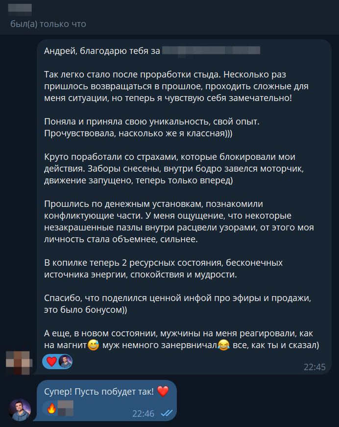 И то, что было тяжёлым и неприятным, вдруг стало лёгким и спокойным. Даже когда продаёшь, уверенность сидит как родная. И знаешь интересный момент — чужие люди чувствуют это изменение ещё раньше, чем ты успеешь с ним свыкнуться. И если ты женщина, то мужчины вокруг вдруг начинают как-то особенно реагировать. В обратную сторону тоже так работает. Такая милая «побочка». Всё как я люблю. Коуч. Помогает людям. Пишет контент, проводит эфиры, предлагает свою помощь.