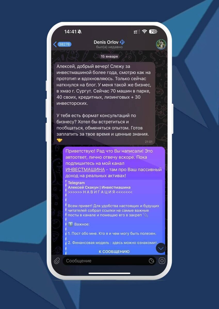 Друзья, всем привет! Ещё зимой в личку прилетело сообщение: «Алексей, слежу за вами больше года. Делаю похожий бизнес — 70 машин в парке, 40 своих, остальные от инвесторов. Нужна консультация, готов оплатить…» Так началось наше знакомство с Денисом Орловым - предпринимателем из Сургута, который сдает в аренду с выкупом инвестмашины в ХМАО. У него уже был стабильный спрос и собственный автопарк. Не хватало ключевого - системы управления. Он интуитивно чувствовал, что рост парка и оборотов еще не означает успех бизнеса и справедливо опасался «болезней роста» Мы подключились, глубоко разобрали бизнес: как работают процессы, какие модели в парке, как ведётся учёт и взаимодействие с инвесторами. Выявили ключевые точки роста и предложили системное решение - от стратегии до конкретных бизнес-процессов. Денис увидел в этом реальную ценность, и мы вышли на партнёрское решение. Так родилась идея подключиться по франшизе и использовать наш опыт и инструменты. 📍Результат? Сегодня Инвестмашина Су