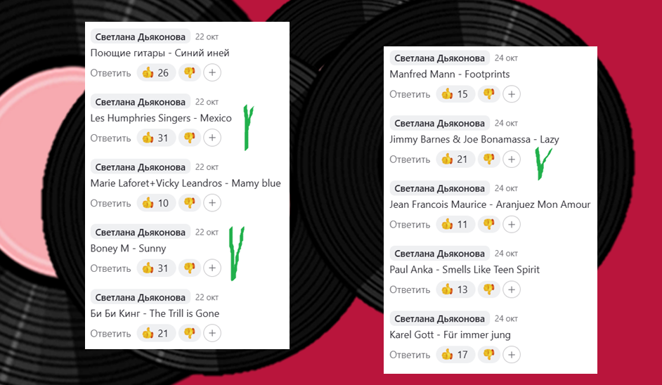 Если хотите быстрее найти голосовалку, настройте комментарии на "Сначала старые", потом поставьте палец вверх той песне, которая нравится больше (под моими комментариями). Можно отмечать все песни, можно ни одну.