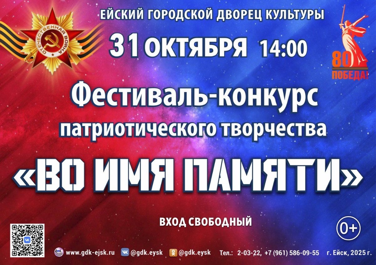 31 октября в 14:00 на сцене Ейского городского дворца культуры им. А.А. Колесникова состоится заключительный концерт фестиваля-конкурса патриотического творчества «Во имя памяти». Вход свободный. В этот день будут подведены итоги конкурса, названы победители, а зрители увидят лучшие творческие номера участников фестиваля: вокальные, хореографические, театральные постановки и патриотические композиции. Ждём Вас среди участников и зрителей! Приходите поддержать талантливую молодёжь и сохранить память вместе 🇷🇺 Справки по тел.: 2-03-22, 8 (961) 586-09-55. 🚀 Подписывайтесь: @gdk_ejsk