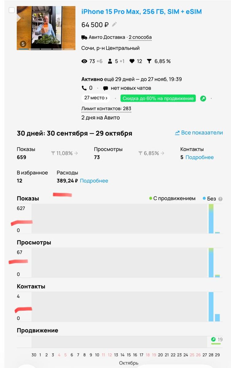 Продолжаем день попадания в рекомендации. На данный момент 600 показов в рекомендациях за день, 60 просмотров 4 контакта с клиентами Рынок перенасыщен, но топим дальше💪🏽 ✅ Что сделано сегодня - подключена авто рассылка с подарком ( всем клиентам кто зашел на объявление но написал) ✅ Снижена цена без редактирования объявления! Важно чтобы не слетели алгоритмы! И все у кого объявления в избранном получили бесплатное уведомление от авито Ставь 🔥 если получается повторять вместе со мной на своих объявлениях в авито!