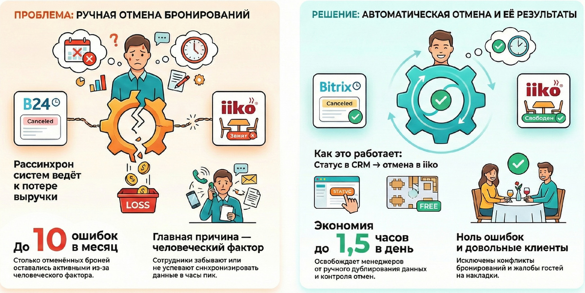 Результат: недовольный клиент, испорченная репутация и упущенная выручка. Причина простая — человеческий фактор: менеджер под нагрузкой забыл отменить бронь в iiko; другой сотрудник