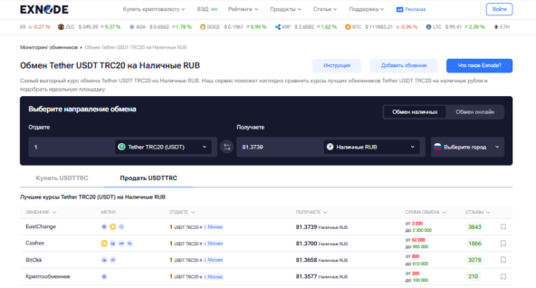 - Направление сделки (например, USDT TRC20 -> наличные рубли).