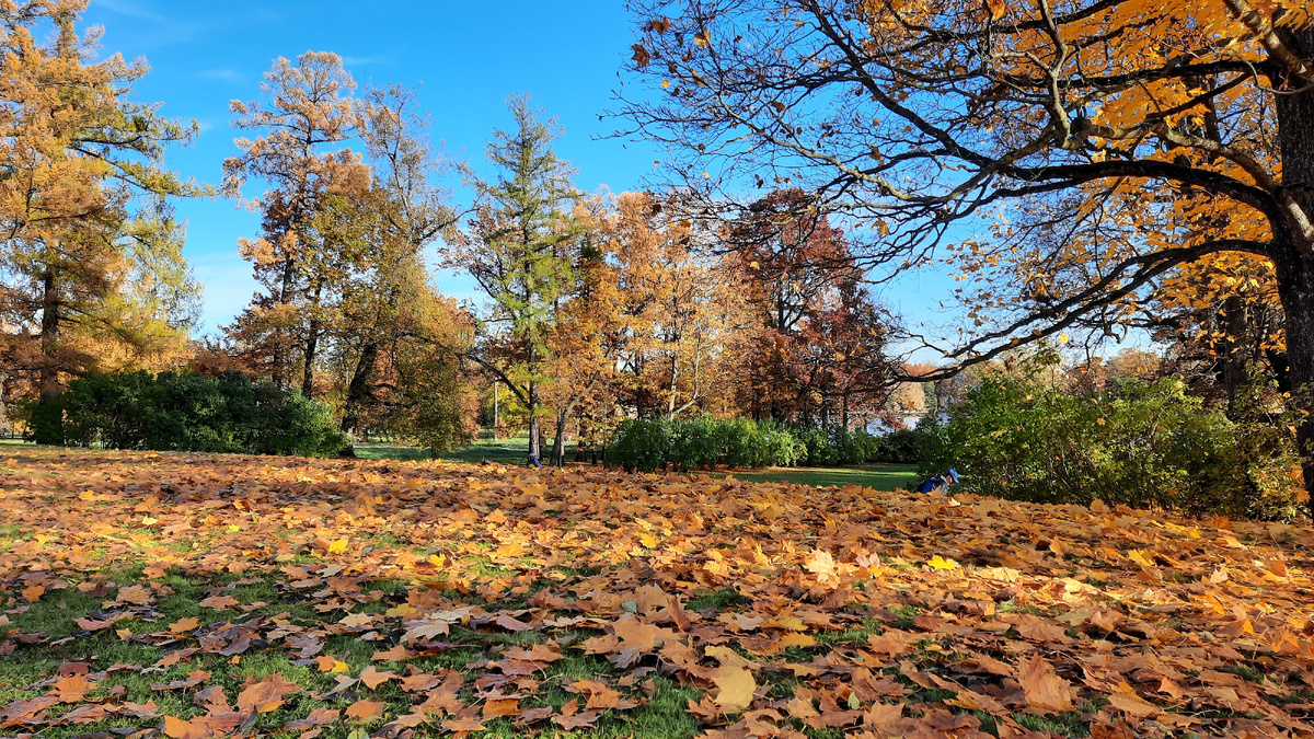 Вечереет. И над озером летают утки. Разжирели. Утка осенью в большой цене. Снова Турецкая баня. И снова Мраморный мост. Смотреть можно бесконечно. Дикий остров в Большом пруду. Чесменская колонна и павильон "Грот" белеет вдали. Другой берег Большого пруда надо подсветить. Дальше пройдём через Готические ворота, за которыми начинается подъём на искусственную земляную гору. Это вдоль южной границы парка. Справа виден этот подъём. Дорожка в