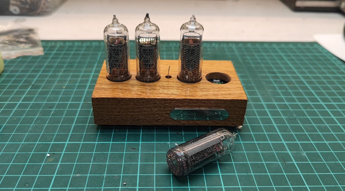 Конструкцию украшает шильдик, судя по надписи - гравировка в мастерской, т.е. часики делались старательно, как артефакт. Чтоб красиво. Забегая вперед скажу - оказалось, это не просто шильдик, а сенсор, касаясь которого можно управлять RGB подсветкой ламп. Забавно.