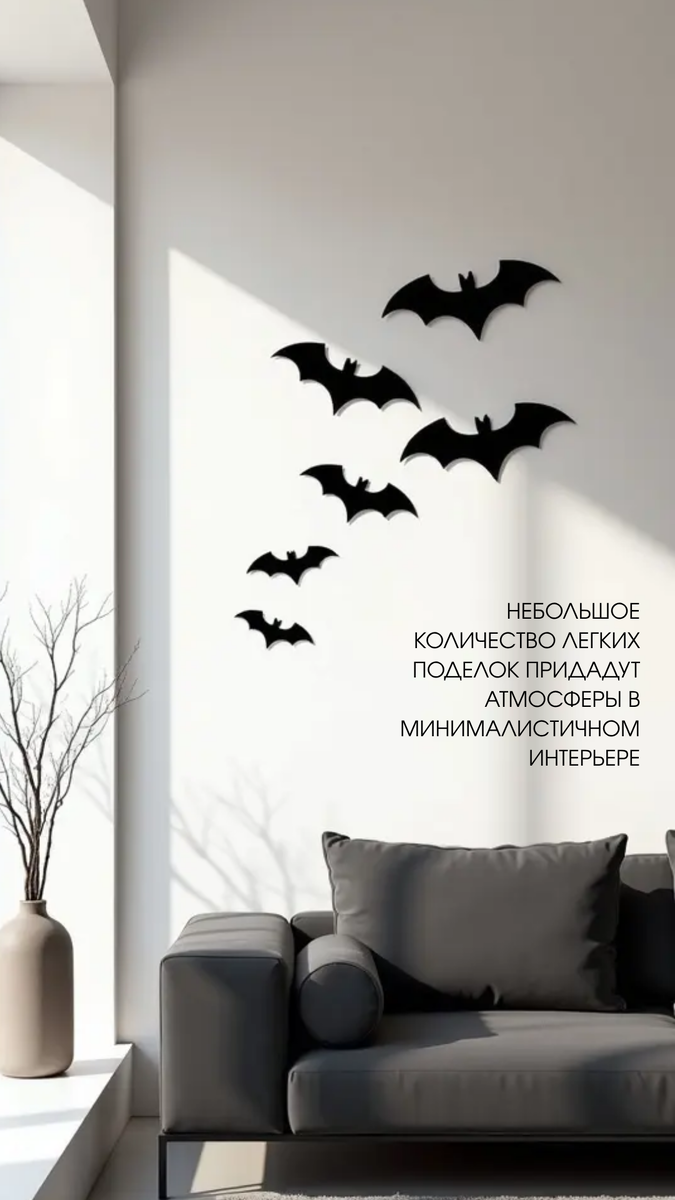 Забудьте про перегруженные композиции и яркие тыквы. Хэллоуин можно сделать атмосферным, загадочным и при этом абсолютно сдержанным. Вот как: 1. Летучие мыши на стене — просто и эффектно Небольшое количество легких поделок придаст атмосферы в минималистичном интерьере. Черные силуэты летучих мышей на белой стене — это не только тематично, но и стильно. Идеально сочетается с чистыми линиями мебели и естественным светом. 2. Теневой рисунок — игра света и тени Создайте мистическую атмосферу с помощью теневого рисунка вокруг источников света. Приклейте или прикрепите маленькие фигурки (летучие мыши, пауки) к абажуру лампы — их тени будут плясать по стенам. Также отлично работает на тюле или неплотных шторах. 3. Сухие ветки + призраки = атмосфера темного леса Просто сухие веточки в вазе и пара минималистичных призраков — и вот уже ваш интерьер дышит таинственностью. Белые, с двумя точками глаз, они выглядят трогательно, а не страшно. Разместите их на книге или полке — акцент будет ут