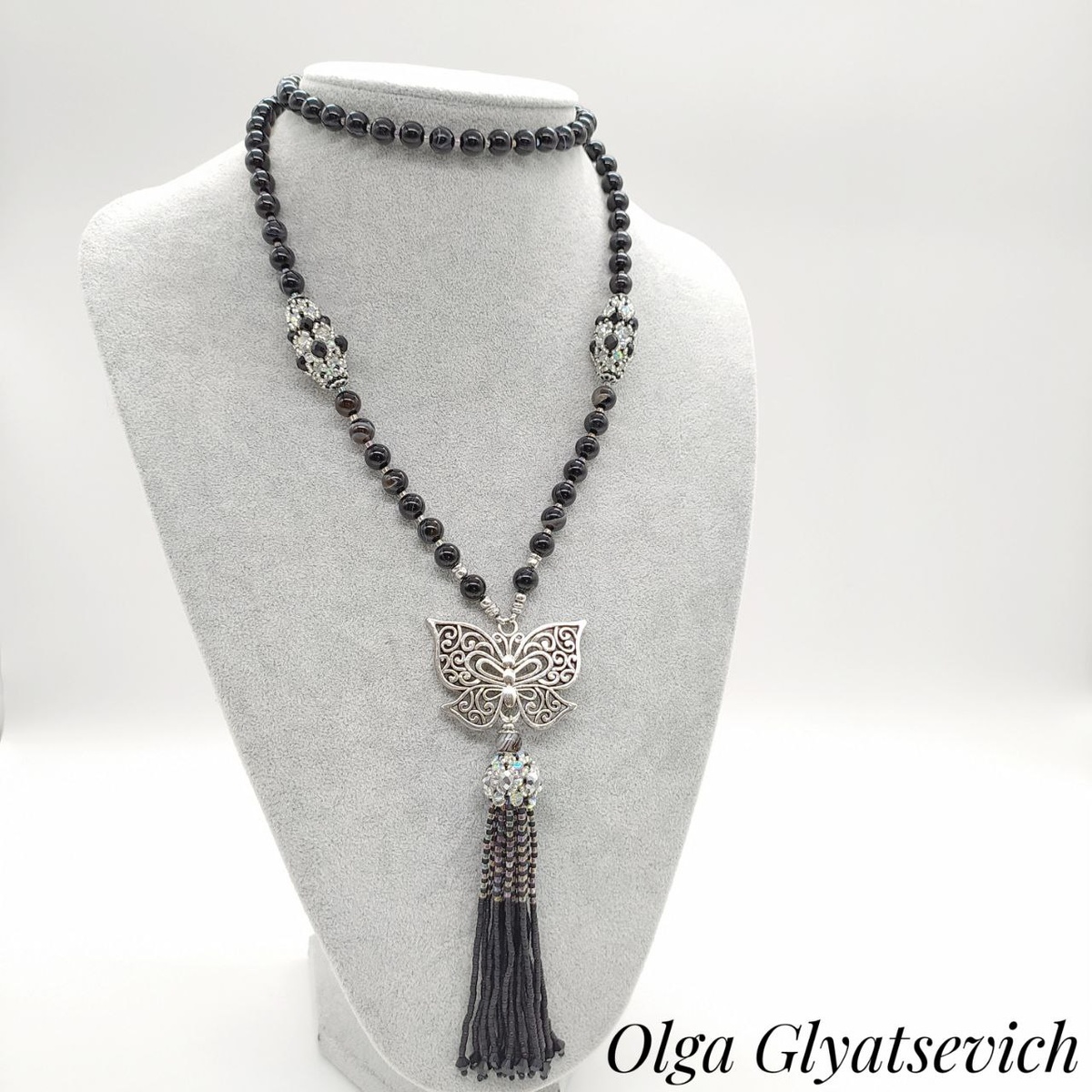 Привет, друзья и ценители уникальных украшений! 💖 Сегодня я с большим удовольствием представляю вам свою новую работу, в которую вложена не только часть моей души, но и много часов кропотливого труда. Это элегантный комплект, состоящий из сотуара и серег, созданный для тех, кто ценит индивидуальность и мастерство. Черный агат – символ силы и элегантности В основе этого комплекта – натуральный черный агат. Этот камень не только притягивает взгляды своей глубокой, таинственной красотой, но и издавна считается мощным оберегом, дарующим владельцу спокойствие, уверенность и защиту от негатива. Его глянцевая поверхность и мягкое мерцание идеально сочетаются с любой одеждой, от строгого делового костюма до вечернего наряда. Сотуар – игра длины и стиля Центральным элементом комплекта является длинный сотуар. Его общая длина составляет 88 см, что позволяет носить его множеством способов: в один или два оборота, комбинировать с другими украшениями. Изящная подвеска с кистью длиной 14 см – эт