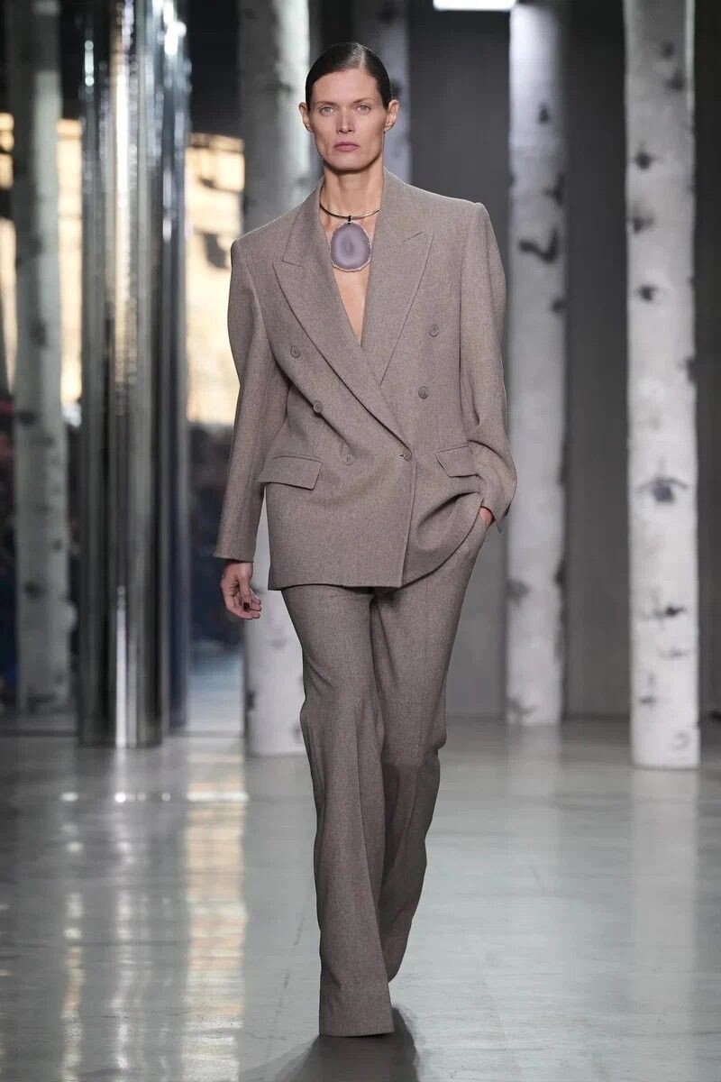 Силуэты: объем на верху (блуза с драпировкой, блейзер с подплечниками), прямые или слегка расклешенные юбки.