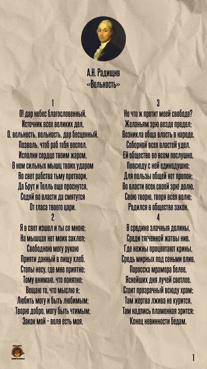 А.Н. Радищев, ода «Вольность» (часть 1) 📖 В понедельник мы с вами знакомились с биографией Александра Николаевича Радищева (вот в этом посте и вот в этом). Давайте узнаем больше с одним из главных произведений в творчестве автора — одой «Вольность». Впервые она появилась в «Путешествии из Петербурга в Москву» как отдельная глава. Герой — путешественник — рассказывает автору о своем произведении. Однако в повести были напечатаны только 14 строф оды. Полный текст появился лишь в 1922 году. «Вольность» можно назвать прямым продолжением од Ломоносова. В отличие от Михаила Васильевича, Радищев восхваляет ни царей и полководцев, а вольность и свободу, которую достигли в Америке. В оде Радищев рассуждает на тему будущего России. Автор описывает страну свободную, без крепостного права. Радищев называет народ господом, судьёй, ценностью страны, а царскую и церковную власть описывает сатирически. Ознакомиться с текстом оды вы можете на карточках. Продолжение будет в следующей части 👉 #Бе