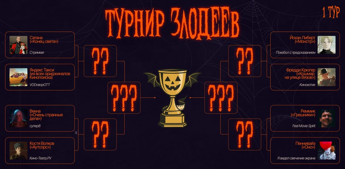 🎃 Объявляем Турнир злодеев на Хэллоуин! Друзья, готовьтесь к самому страшному турниру года! Мы запускаем Турнир злодеев с дружественными телеграм-каналами! Мы подготовили турнирную сетку, в которой каждый канал выбирает по одному злодею из культовых сериалов. 🗓 Как это работает: 1. Каждый канал публикует пост с голосованием и представляет своего злодея. 2. Второй канал из пары делает репост — так будут проходить все этапы турнира. 3. Голосование длится 24 часа. Победитель пары выходит в следующий тур! 💀 Четвертьфинал — 29 октября. 👹 Полуфинал — 30 октября. 👑 Финал — 31 октября. 👻Каналы, участвующие в турнире: @strimmi @vodott @moviehorse @kino_teatrru @penpenwork @kinokotik @feelmoviespirit @ershovfilm --- 💬 В этом четверть-финале участвуют: Фредди Крюгер ("Кошмар на улице Вязов") от @kinokotik против Йохана Либерта (из "Монстра") от @penpenwork Ждем ваших голосов! 👇