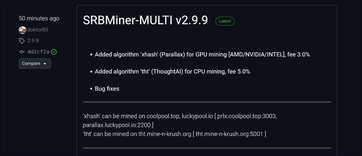 SRBMiner-MULTI v2.9.9 — Добавлен алгоритм 'xhash' (Parallax) для майнинга на GPU [AMD/NVIDIA/INTEL], комиссия 3,0% — Добавлен алгоритм tht (ThoughtAI) для майнинга на CPU, комиссия 5,0% Скачать