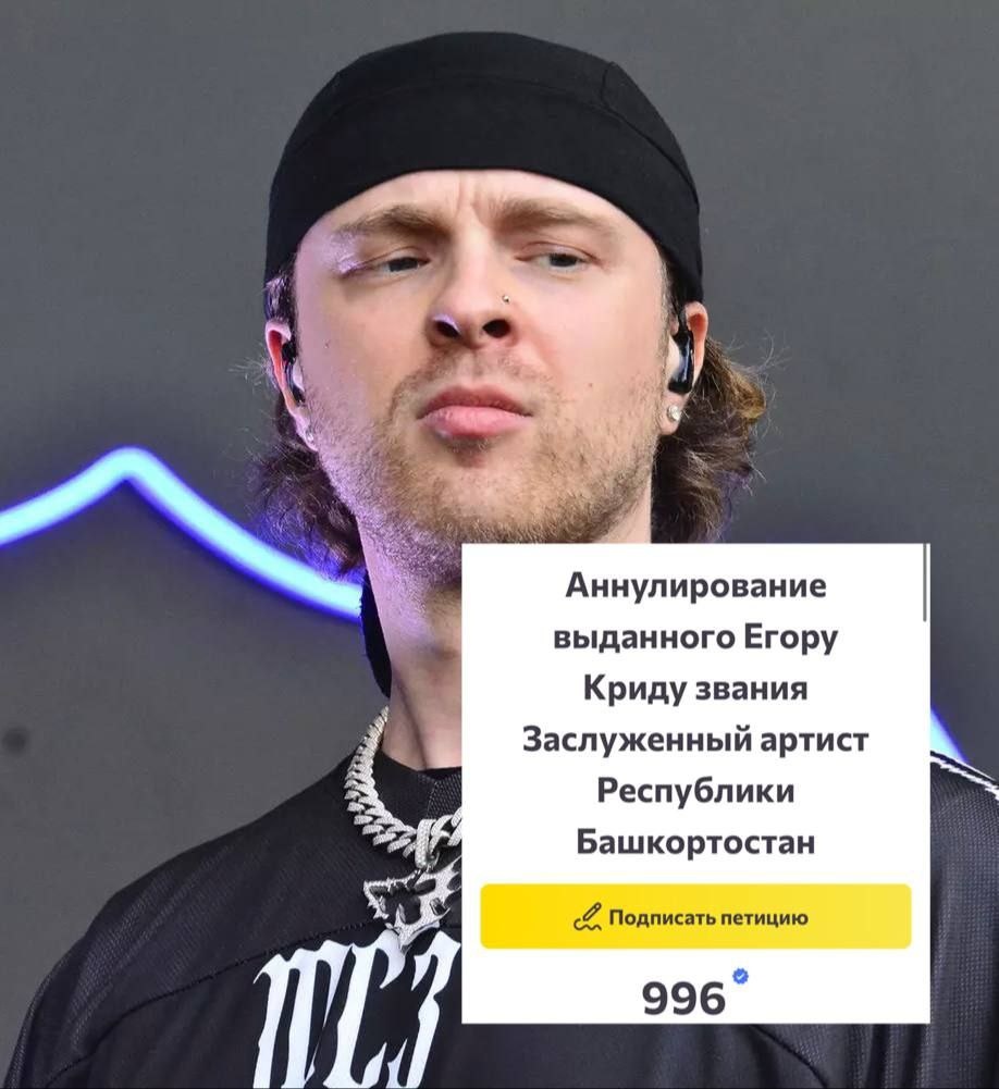 Петиция жителей Башкортостана призывает отозвать звание народного артиста у Егора Крида Население Республики Башкортостан инициировало сбор подписей, призывая аннулировать награду местного значения, присвоенную Егору Креду. Авторы обращения подчеркнули, что творчество исполнителя, насыщенное грубой речью, ставит под сомнение правомерность предоставления ему столь почетного статуса. По состоянию на сегодняшний день количество поддержавших инициативу превысило отметку в девятьсот голосов.