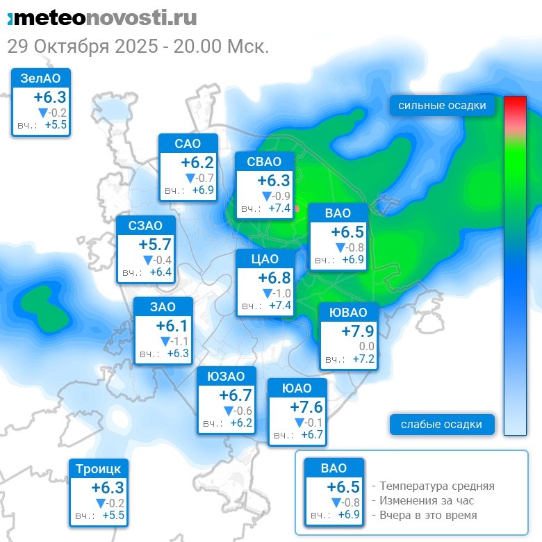 В 20:00 в Москве было от +5.2°C до +8°C, средняя температура +6.6°C #погода #Москва #осень #температура #29октября #среда