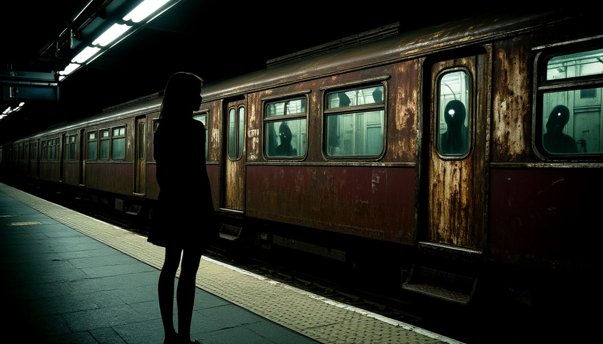 Леночка опаздывала. Она бежала по гулкому вестибюлю метро, цокая каблуками и чертыхаясь сквозь зубы. Надо же было засидеться в офисе допоздна! А всё этот злополучный отчет, который требовал сдать шеф. Теперь её ждал нагоняй от подруги Катьки, с которой они договорились встретиться в 10 вечера. На платформе было безлюдно. Часы показывали 22:20. Леночка нервно притопывала ногой, глядя в темноту тоннеля. Ну где же поезд? Минуты ползли бесконечно долго. Вдруг из тоннеля повеяло холодом. У края платформы замерцал тусклый свет. Послышался приглушенный скрежет, непохожий на обычный шум приближающегося состава. Из мрака медленно выплыл старый потрепанный вагон. Он разительно отличался от современных сверкающих поездов. Ржавый, с потемневшими окнами и облупившейся краской, он будто прибыл из другой эпохи. Двери со скрипом отворились прямо перед Леночкой. На табло замигала надпись: "Посадка закончена. Следующий поезд - через 40 минут". У Леночки екнуло сердце. Ждать еще почти час? Катька с неё т