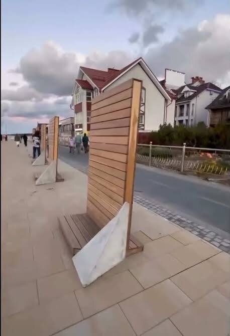В Зеленоградске на променаде установили необычные вертикальные лавочки в рамках проекта «Янтарный талисман». Эти сооружения вызвали неоднозначную реакцию и шутки среди местных жителей, которые называют их «расстрельными стенками» или «стоячими местами для припарковки людей». Представители администрации пояснили, что это элемент дизайна, а неудобные скамейки, тренажёры и качели убрали из соображений безопасности и для обновления облика набережной.