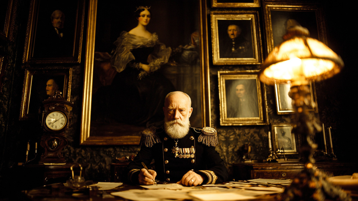 Это Франц Иосиф I, император Австро-Венгрии. Человек-монумент. Символ уходящей эпохи. Снаружи бушует мировая война, та самая, что навсегда похоронит его мир. А здесь, в тишине кабинета, слышен лишь скрип пера и тиканье часов. Его личный врач уже шепчет о постельном режиме, но император отмахивается. Ему нужно закончить бумаги. Всегда — бумаги.