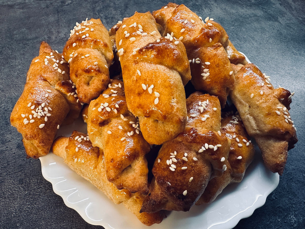 Всем привет! В это пасмурное утро, спешу с вами поделится вкусным рецептом рогаликом. Смешать все ингредиенты Замесить тесто, чтобы не липло к рукам Разделить его на две части, так легче его будет раскатывать Поверхность присыпать небольшим количеством муки и раскатать пласт толщиной примерно 2 мм и разрезать на 8 равных частей Сформировать рогалики, смазать их желтком и украсить сверху кунжутом и отправить запекаться в разогретую духовку при температуре 180 градусов на 15-20 минут Запах невероятный будет распространяться по всей квартире во время приготовления И вот такие невероятно пышные и вкусные получается 16 штук творожных рогаликов