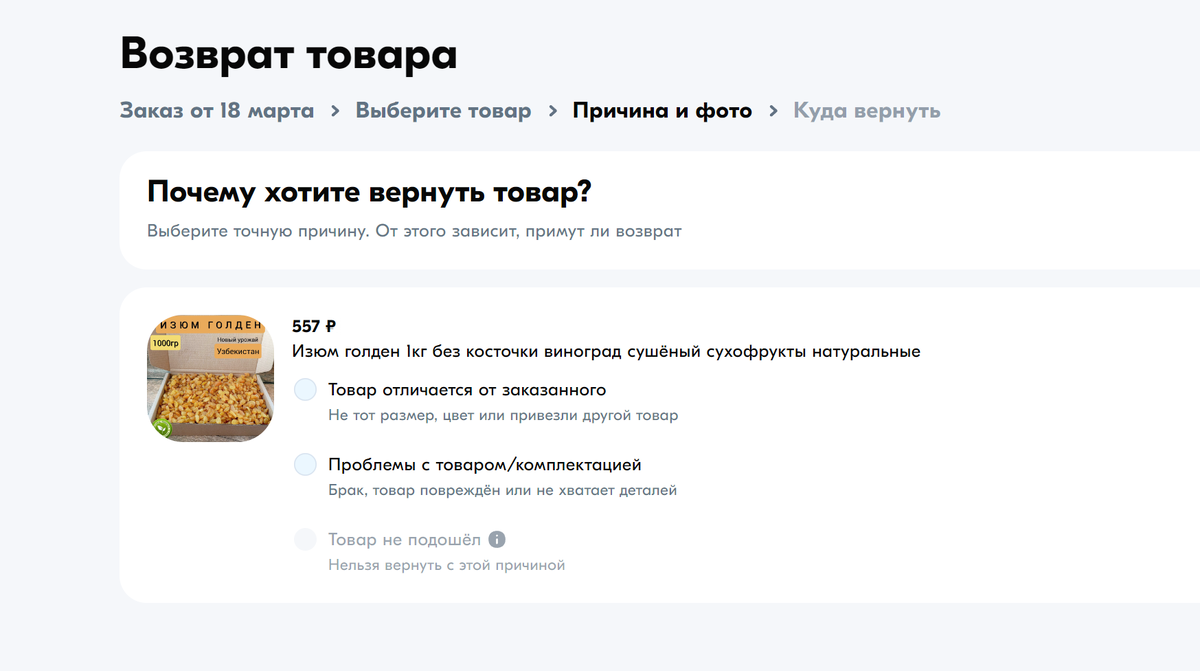 Здравствуйте. Хочу поделиться своим опытом удачного решения вопроса с возвратом товара ненадлежащего качества, несмотря на название статьи. Заказали сухофрукты с доставкой на дом, шесть позиций, однако изюм, несмотря на исключительно положительные отзывы, оказался плесневым. Мы нередко заказываем изюм, уже много лет и плесневый не попадался ни разу. А тут сорт Голден, он прозрачно-жёлтый и всё видно. Я выяснил, что просто тщательно помыть и обдать кипятком такой изюм не получится, что он непригоден в употребление, может нанести вред организму, такой изюм только на выброс. Поэтому я тут же сделал фотографии, самой упаковки со всех сторон, самого изюма, причём со вспышкой, так лучше заметна плесень. Я не в первый раз делаю заявку на возврат, и бывали случаи, когда её одобряли буквально уже через несколько минут, но в этот раз было не так. Сразу же, в день получения, 22 марта 2025, начал оформлять возврат товара. Отмечу что, конкретно этот товар нельзя вернуть, если он просто не подошёл,