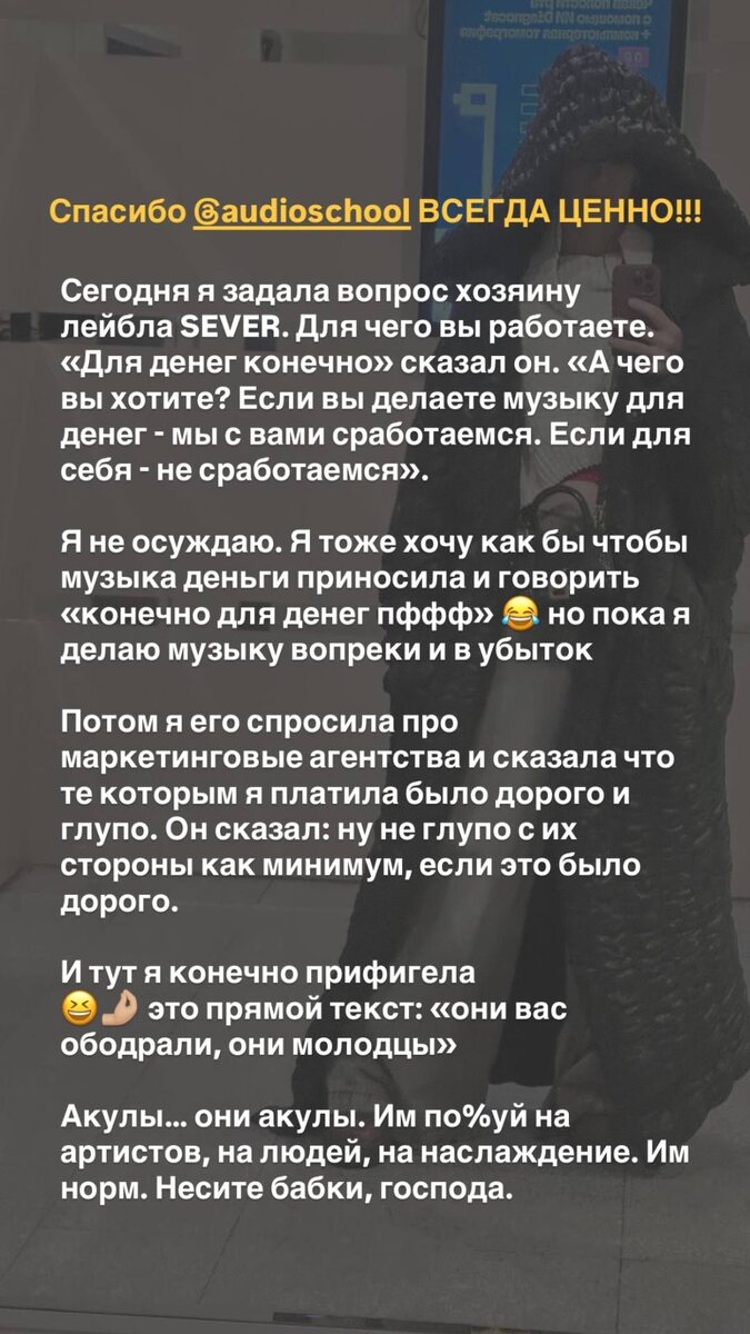 Вчера я задала вопрос хозяину лейбла SEVER. Для чего вы работаете. «Для денег конечно» сказал он. «А чего вы хотите? Если вы делаете музыку для денег - мы с вами сработаемся. Если для себя - не сработаемся». Я не осуждаю. Я тоже хочу как бы чтобы музыка деньги приносила и говорить «конечно для денег пффф» • но пока я делаю музыку вопреки и в убыток Потом я его спросила про маркетинговые агентства и сказала что те которым я платила было дорого и глупо. Он сказал: ну не глупо с их стороны как минимум, если это было дорого. И тут я конечно прифигела это прямой текст: «они вас ободрали, они молодцы» Акулы... они акулы. Им по%уй на артистов, на людей, на наслаждение. Им норм. Несите бабки, господа.