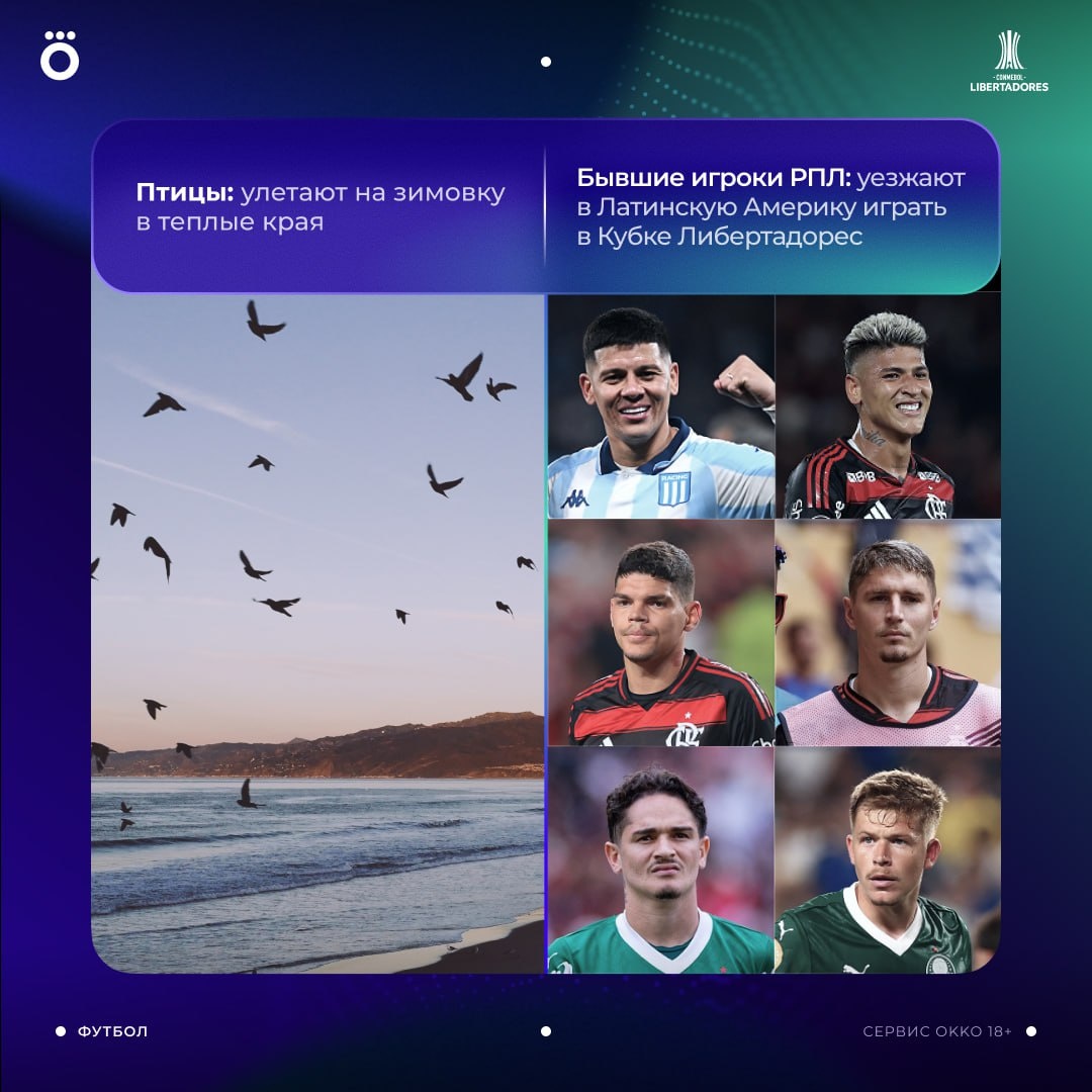 Куда уезжают играть бывшие игроки РПЛ? В Латинскую Америку, чтобы выступать в Кубке Либертадорес 💪🏻 Маркос Рохо, Хорхе Карраскаль, Айртон, Гильермо Варела, Келлвен и Бруно Фукс — знакомые фамилии, которые ты можешь услышать в рамках 1/2 финала главного футбольного турнира Южной Америки. Этой ночью включай ответный матч «Расинга» и «Фламенго» — посмотрим на старых знакомых! 🙌🏻