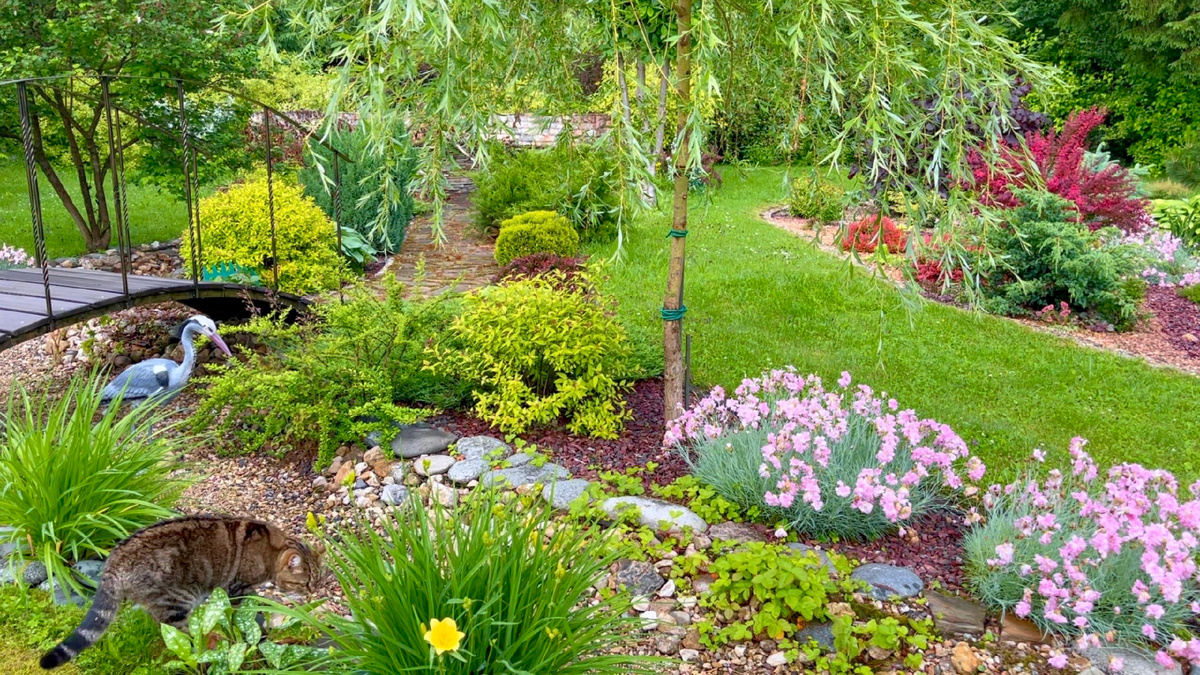 Чего опасалась, то и произошло — подниматься и спускаться не удобно. Но переделывать было поздно. Причем, со стороны мостик не смотрится "горбатым", и муж ходит по нему спокойно, а я стараюсь обходить. Зато наша кошка мостик любит, даже спит на нем, и я в шутку называю наш мостик кошкиным.
