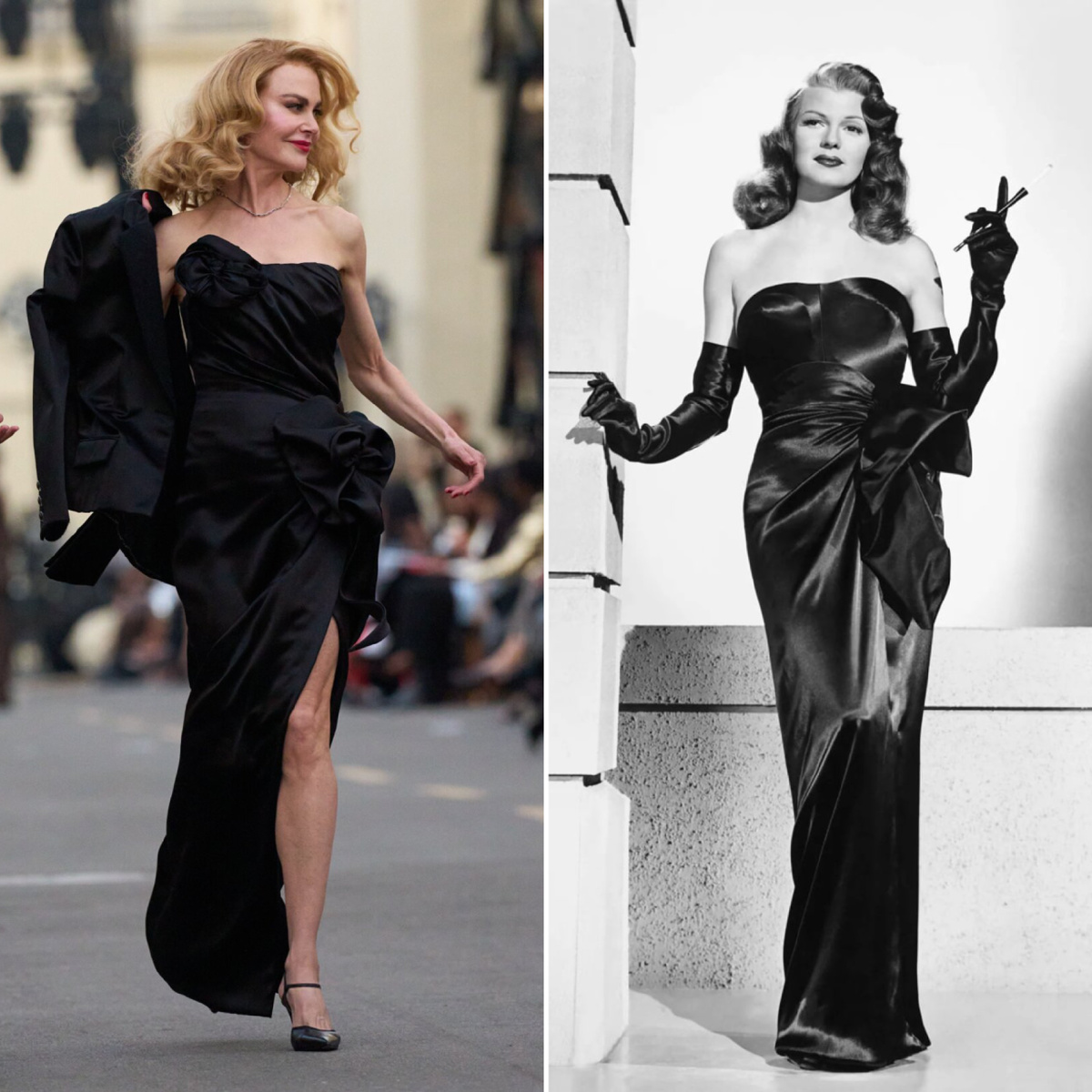 Открывала шоу Николь Кидман. Она появилась в образе, который был прямым реверансом классическому нуару: чёрное сатиновое платье, драпированное как у Риты Хейворт в «Гильде» 1946 года. Платье сделали на заказ в Chanel.