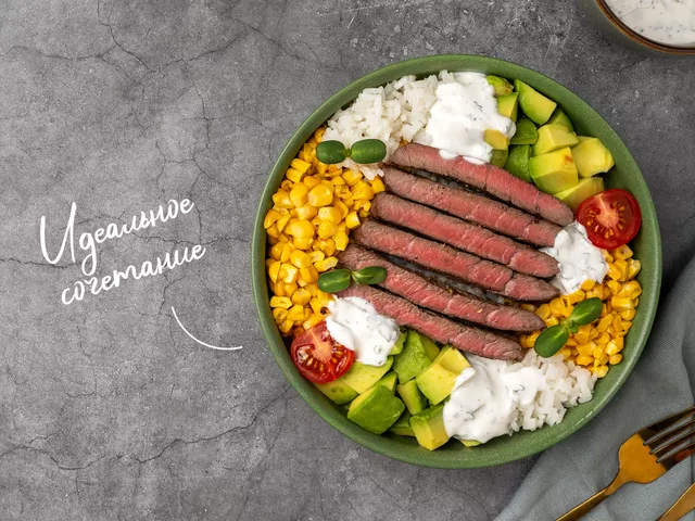 Сочный стейк прожарки станет главным героем этого питательного и ароматного боула, а компанию ему составят запеченная кукуруза и авокадо. Этих ингредиентов будет достаточно для сытного обеда или ужина, но при желании блюдо можно дополнить консервированной фасолью и половинами помидоров черри. Продукты для рецепта Для стейка Стейк из мраморной говядины 300г Оливковое масло 2 ст. л. = 34 г Сушеный чеснок 1 ч. л. = 3 г Сушеный репчатый лук 1 ч. л. = 4 г Для боула Кукуруза 1 шт. = 300 г Оливковое масло 1 ст. л. = 17 г Авокадо 1 шт. = 220 г Лайм 0,5 шт. = 30 г Соль