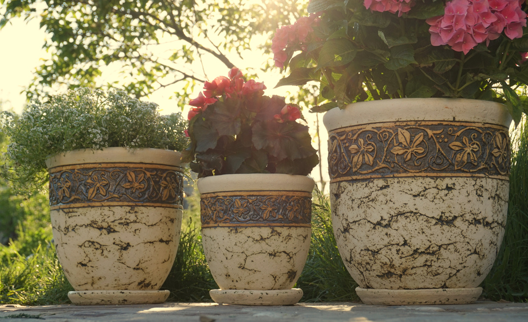 Горшки, сделанные своими руками, могут быть не менее привлекательными. Контейнеры из гипса или бетона прекрасно украсят веранду.