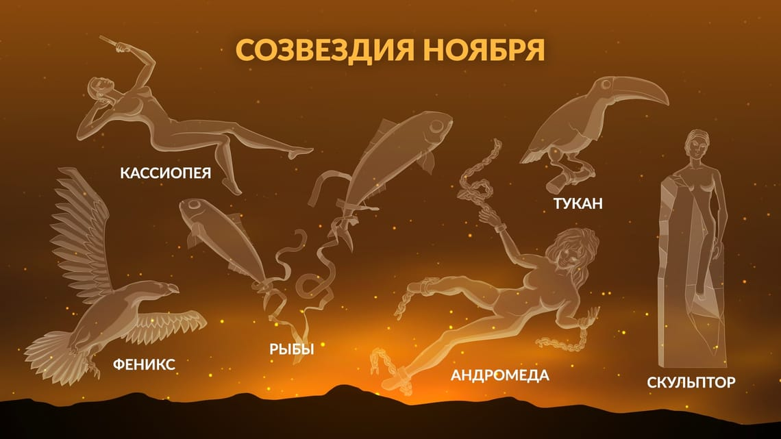 В ноябре на звездном небе можно отыскать шесть созвездий — ярких Кассиопею и Андромеду и более тусклых Рыб, Скульптора, Феникса и Тукана.