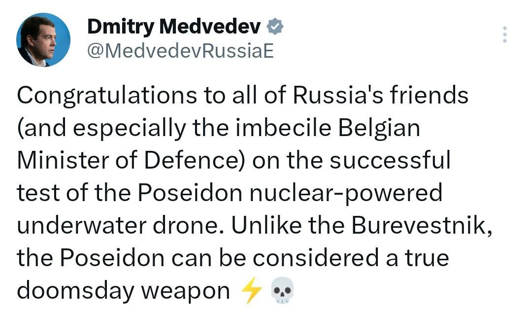 В ответ на пост Congratulations are in order for Poseidon drone test SUCCESS Medvedev calls it a 'true DOOMSDAY weapon' 'IMBECILE' Belgian defense chief gets a special mention